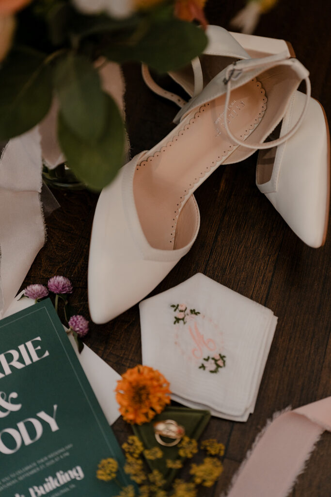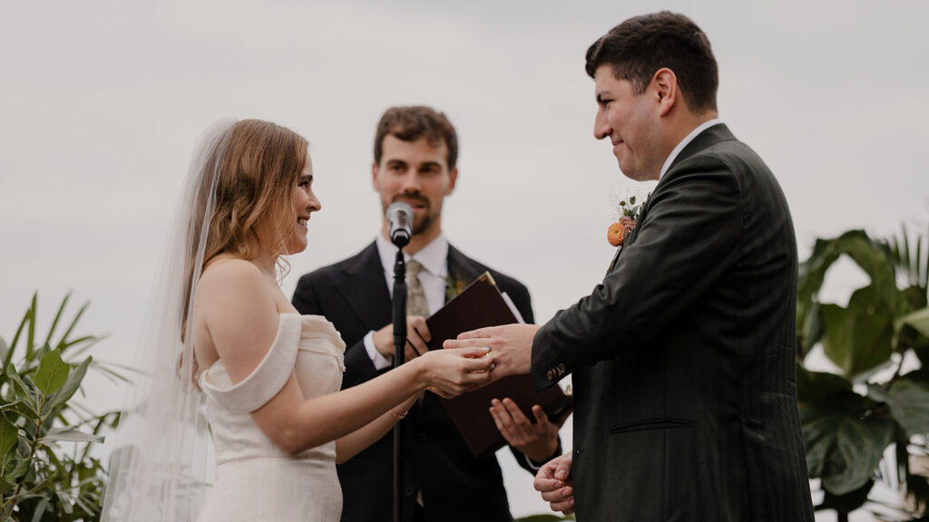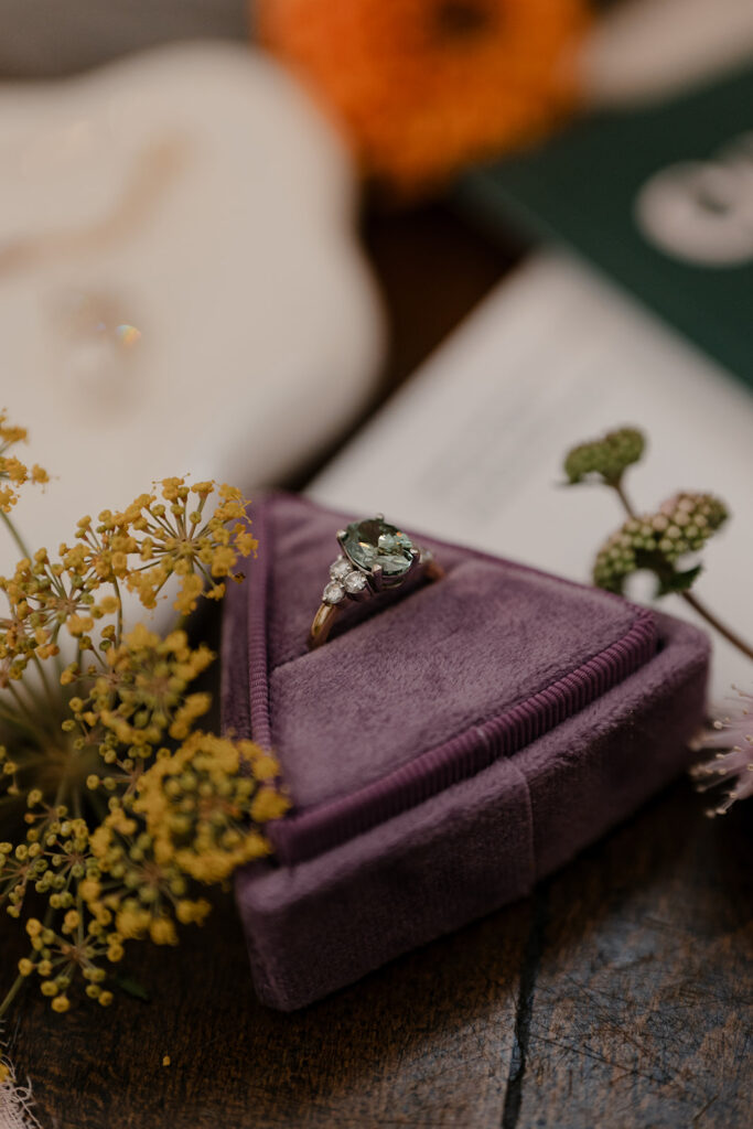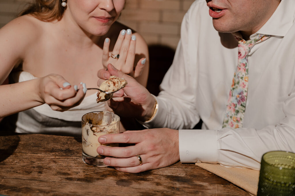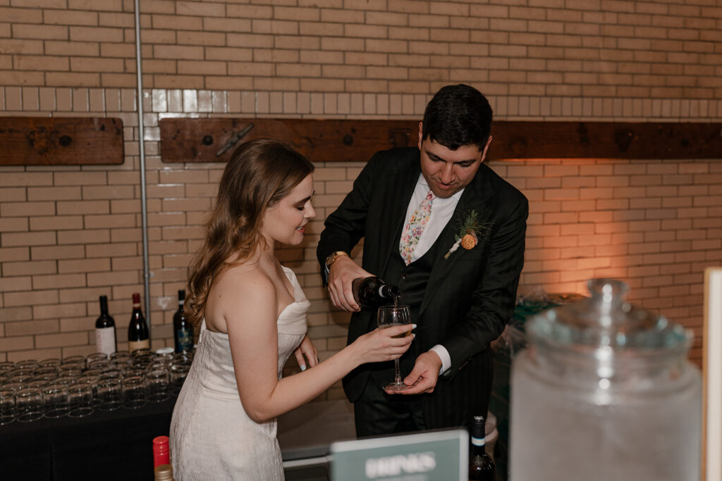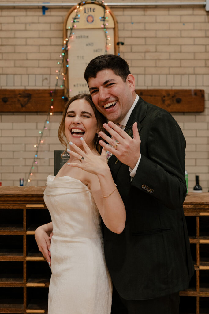 The bride wore a stunning gown designed by Aesling, purchased just steps away at Kinfolk within Bok, and tailored to perfection by Prim and Perverse. Hair and makeup by Karlie Craskey kept everything polished yet natural, adding the finishing touches to Corrie’s bridal look. Custom wedding bands from Golden Nugget featured emerald green stones with gold banding, especially crafted for them.