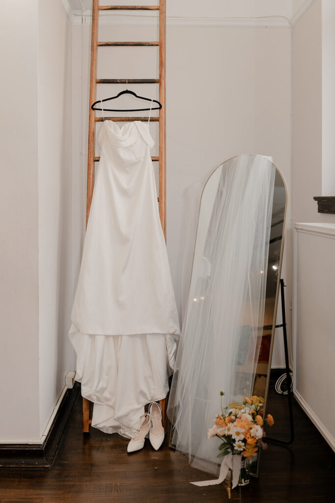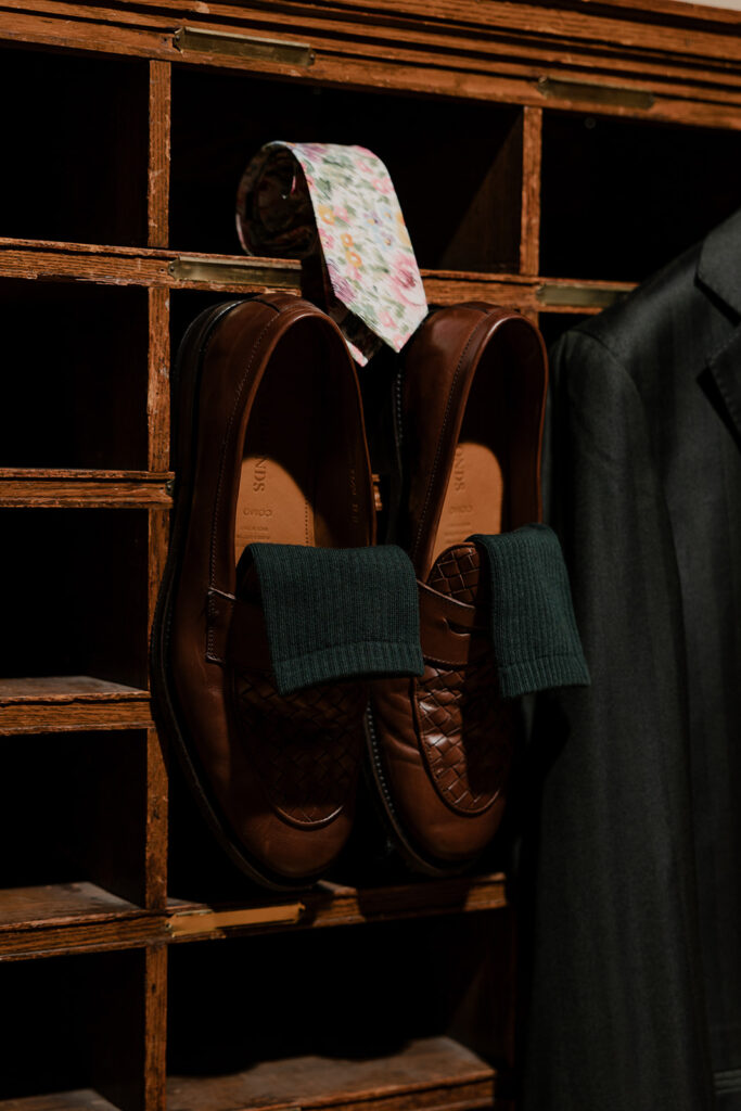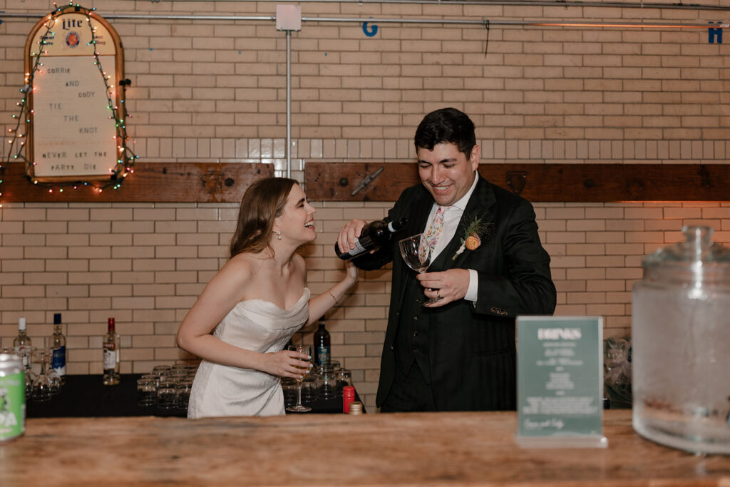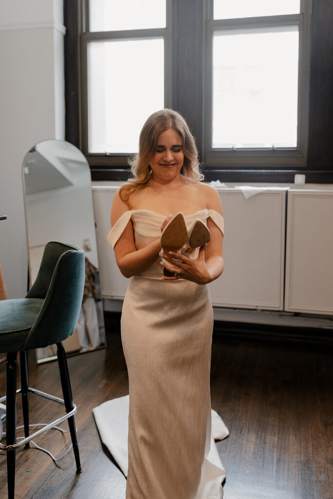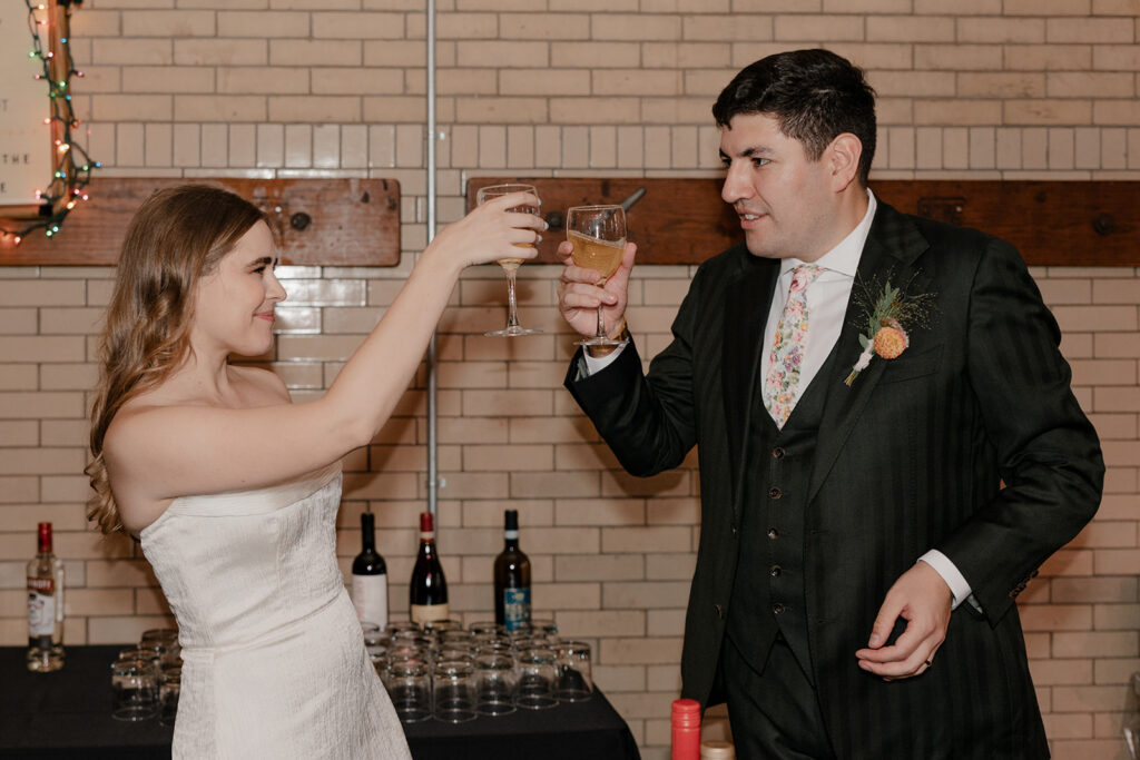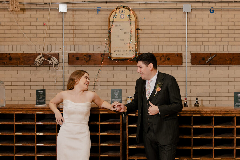 The bride wore a stunning gown designed by Aesling, purchased just steps away at Kinfolk within Bok, and tailored to perfection by Prim and Perverse. Hair and makeup by Karlie Craskey kept everything polished yet natural, adding the finishing touches to Corrie’s bridal look. Custom wedding bands from Golden Nugget featured emerald green stones with gold banding, especially crafted for them.