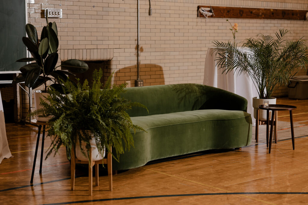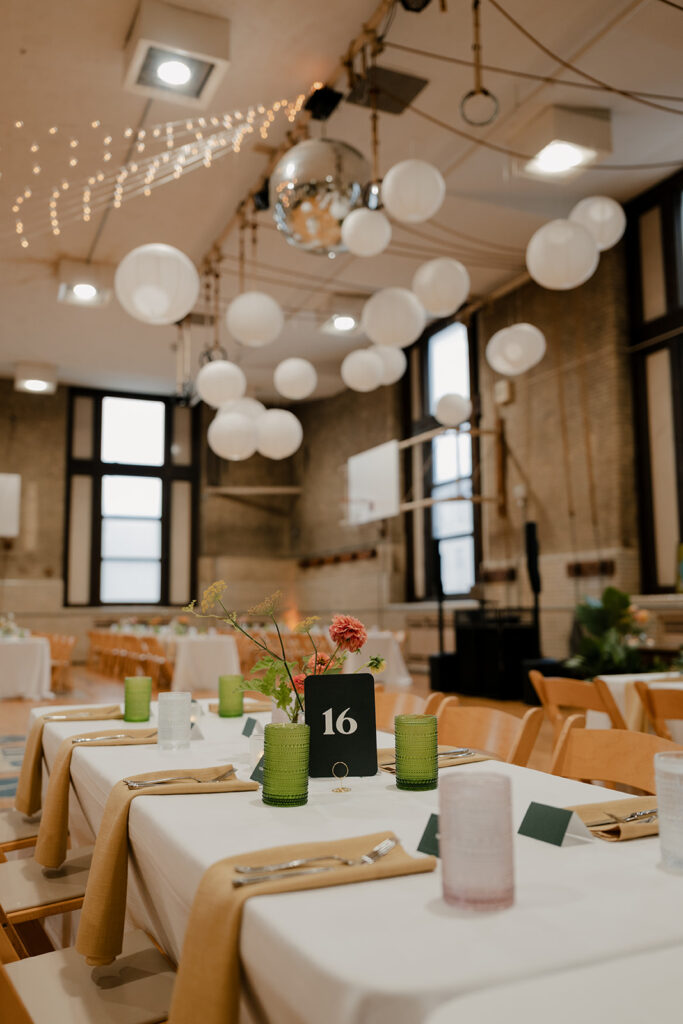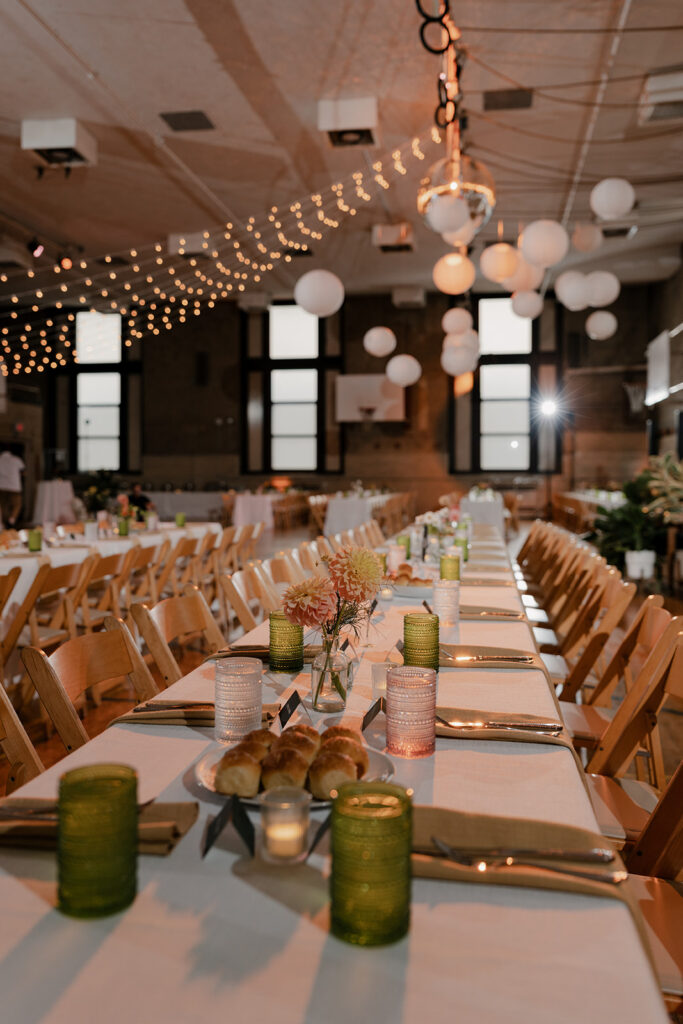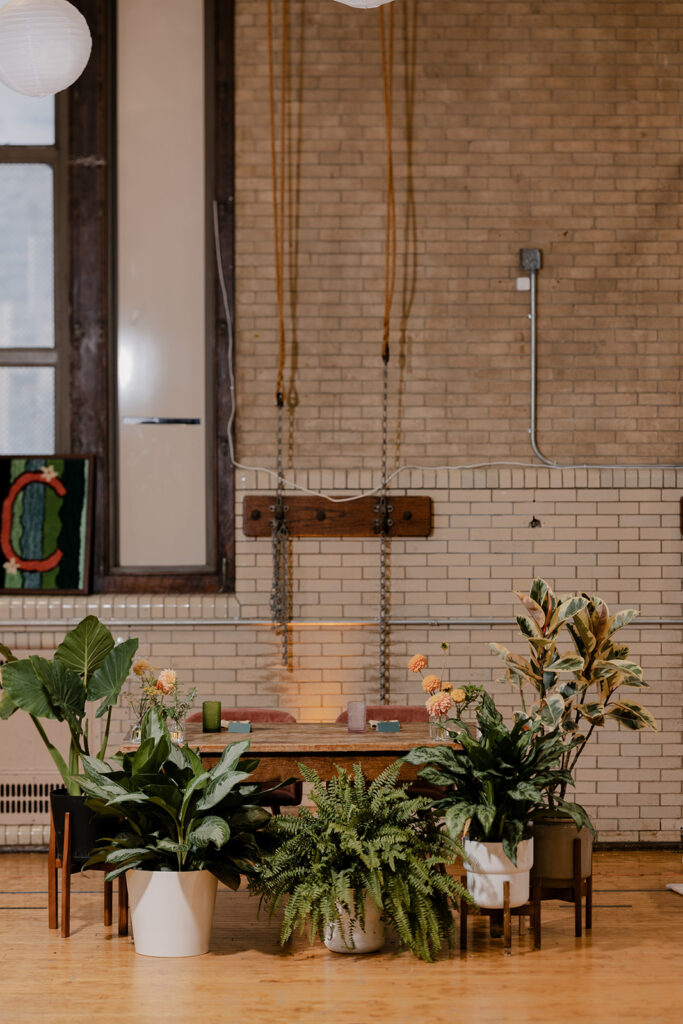 Tropical, abundant florals repurposed from the ceremony filled the gymnasium, featuring gorgeous plant rentals from Greenly Plant Co., whose studio is also located (you guessed it!) inside the Bok Building. Behind the couple’s table hung two custom tufted rugs they made together at Tuft The World– talk about a fun date night!!!