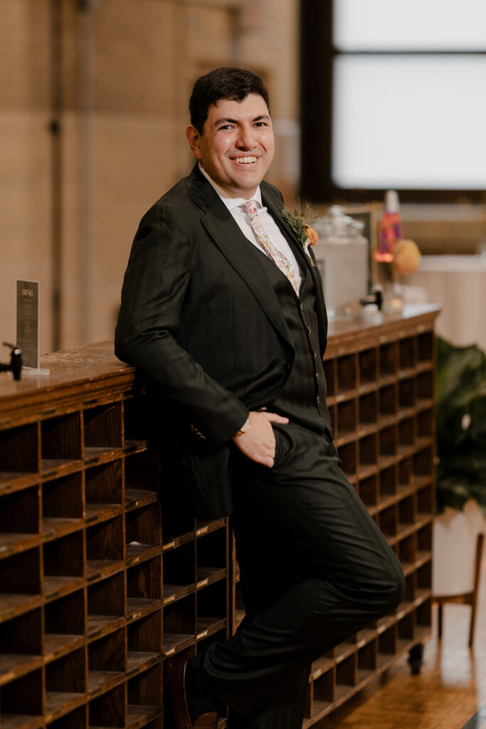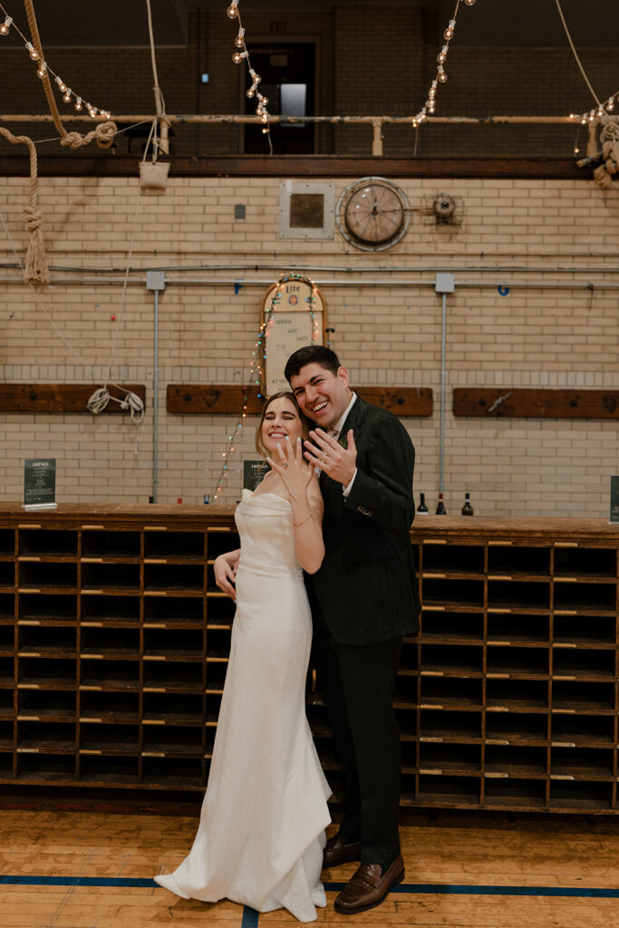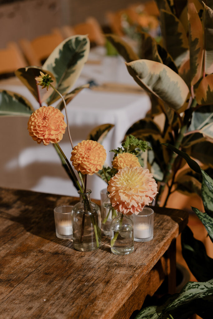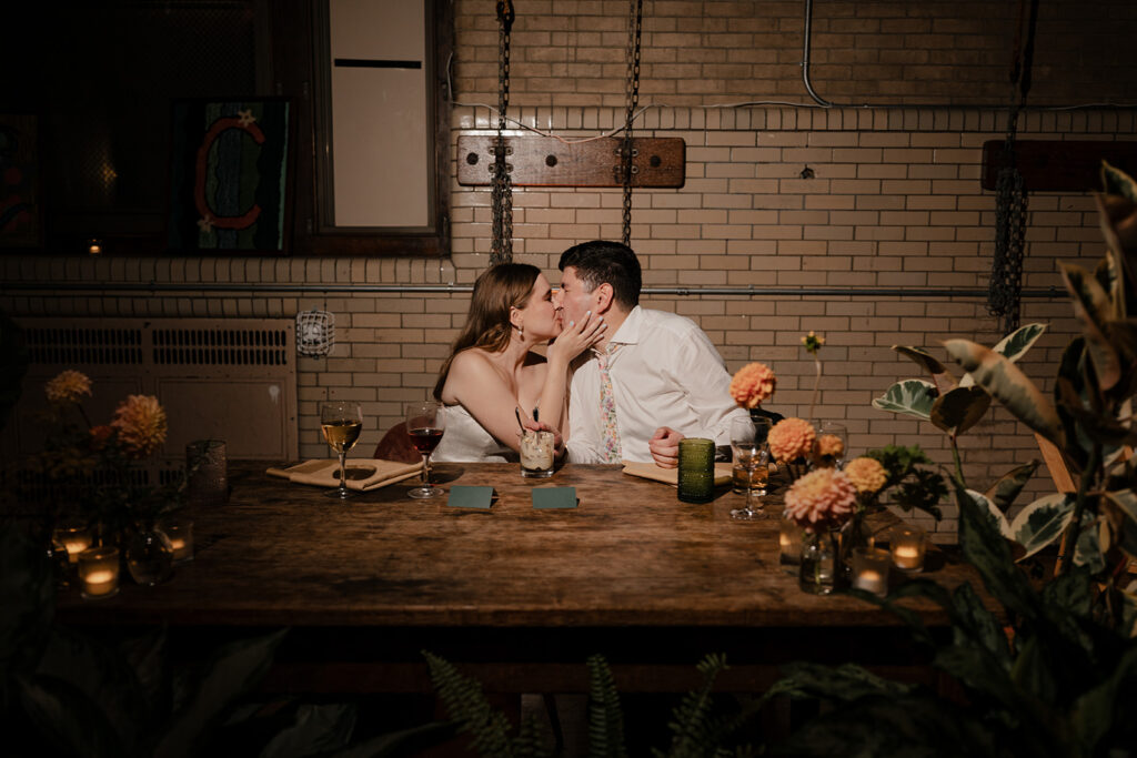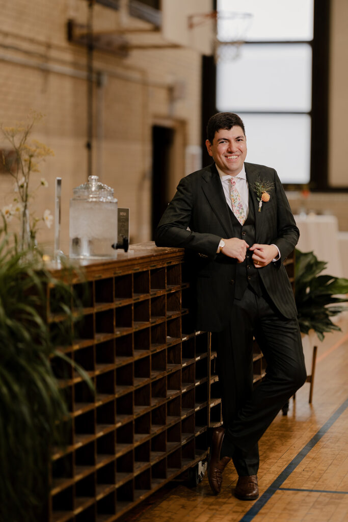Tropical, abundant florals repurposed from the ceremony filled the gymnasium, featuring gorgeous plant rentals from Greenly Plant Co., whose studio is also located (you guessed it!) inside the Bok Building. Behind the couple’s table hung two custom tufted rugs they made together at Tuft The World– talk about a fun date night!!!