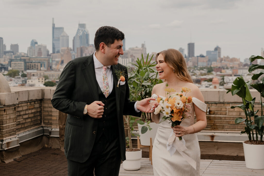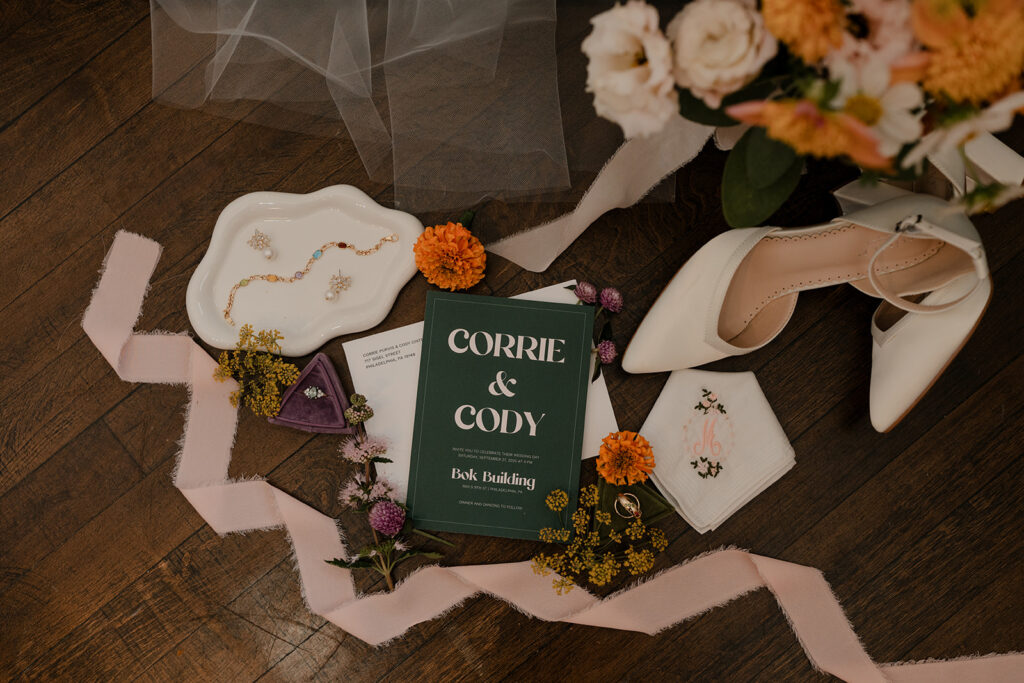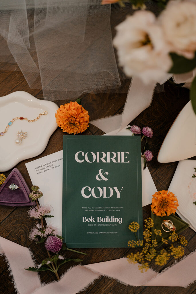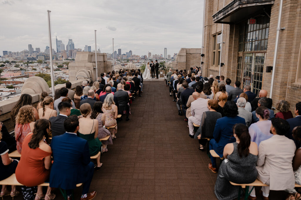 This late-summer rooftop wedding took place at the iconic Bok Building in the heart of South Philadelphia. Bok is special not just because of its stunning views or fun school vibes, but all the love, stories, businesses and people that came together to make this wedding and the Bok building what it is! To those who don’t know about Bok, it is a former high-school that has been repurposed into workspaces for Philadelphia makers, businesses, nonprofits, and artists. There’s nothing more romantic than perfectly executing a wedding that is close to home, supports local businesses and artists, and most importantly, fosters love, connection, and a lifetime of memories. That’s just a small piece of what made Corrie and Cody’s day truly, unforgettable. *if you’re not crying yet, I hope you will be*