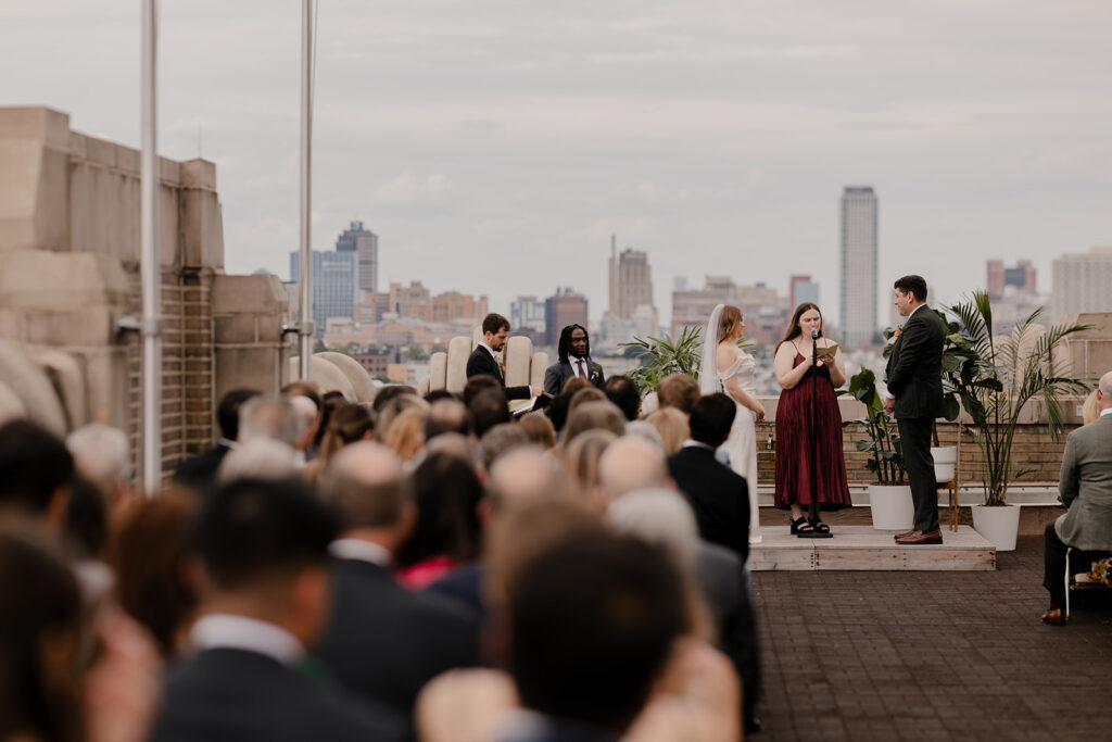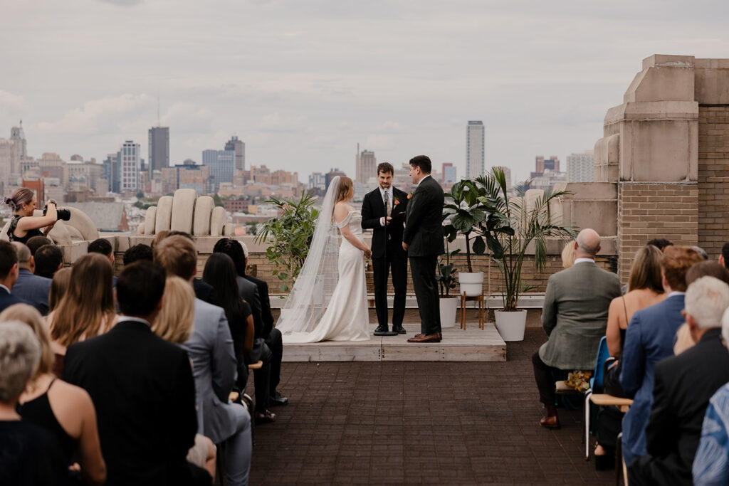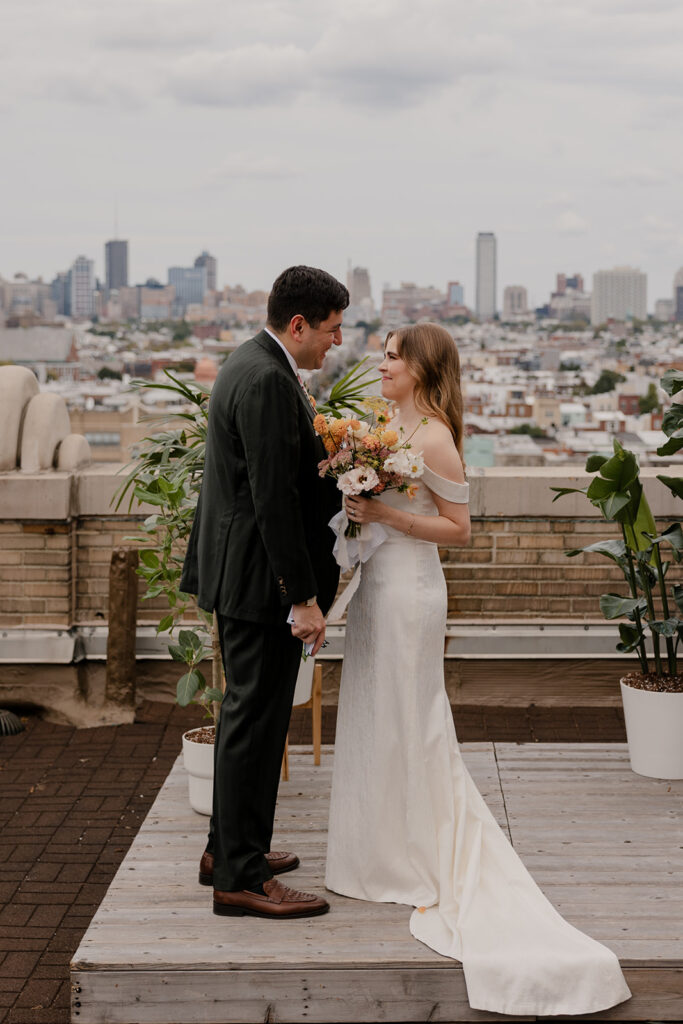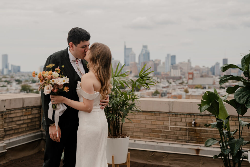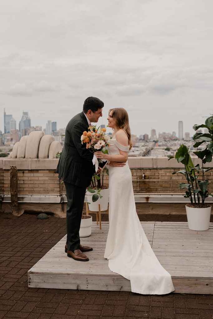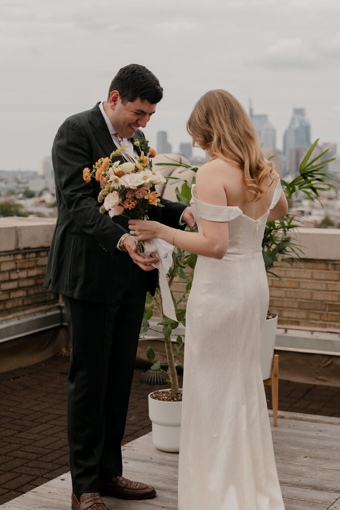 Thoughtful planning and coordination by the oh so lovely, Philly DIY Weddings made the day flow seamlessly from start to finish (which is impressive when there’s only one elevator and multiple floors involved!). Jackie and her team also handled the florals, hand-picked and curated with soft pinks, peaches, oranges, yellows and cream- YUM! The beautiful ceremony unfolded on the Rooftop, surrounded by the couple’s close friends and family, where the warm summer air and vibrant greenery framed a full 360-degree cityscape.