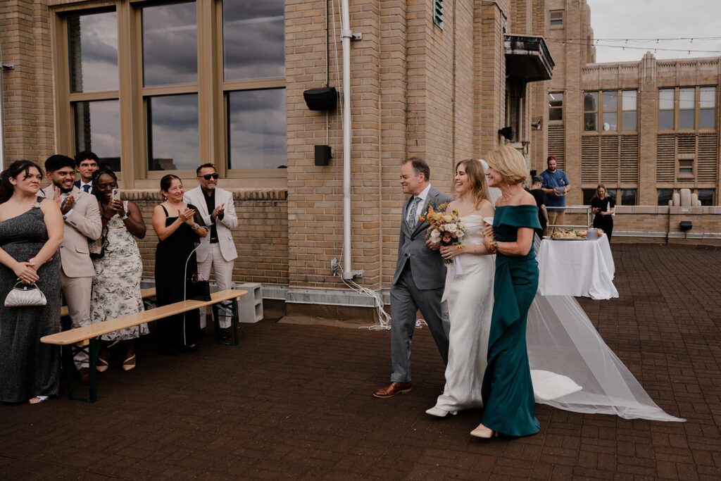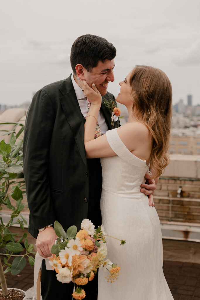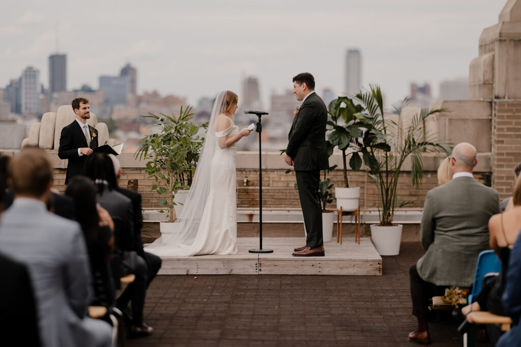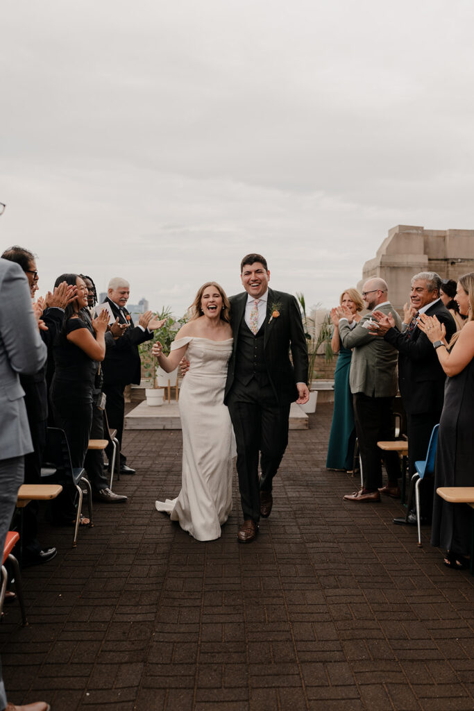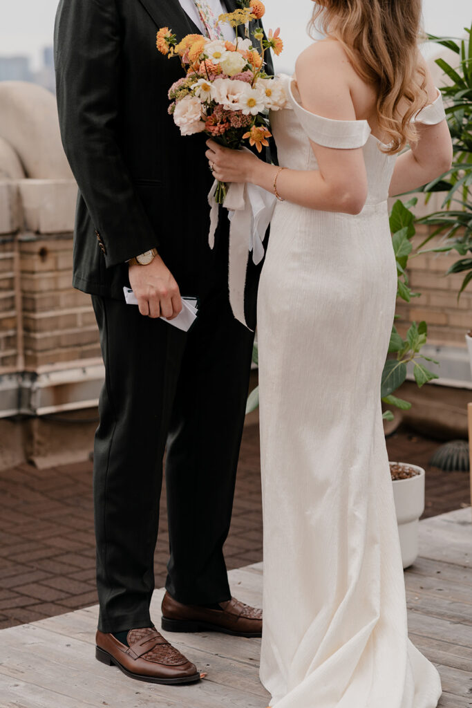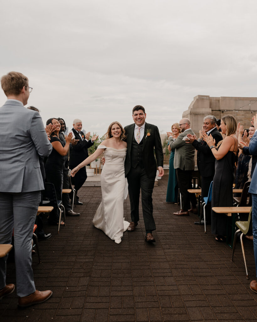 Thoughtful planning and coordination by the oh so lovely, Philly DIY Weddings made the day flow seamlessly from start to finish (which is impressive when there’s only one elevator and multiple floors involved!). Jackie and her team also handled the florals, hand-picked and curated with soft pinks, peaches, oranges, yellows and cream- YUM! The beautiful ceremony unfolded on the Rooftop, surrounded by the couple’s close friends and family, where the warm summer air and vibrant greenery framed a full 360-degree cityscape.